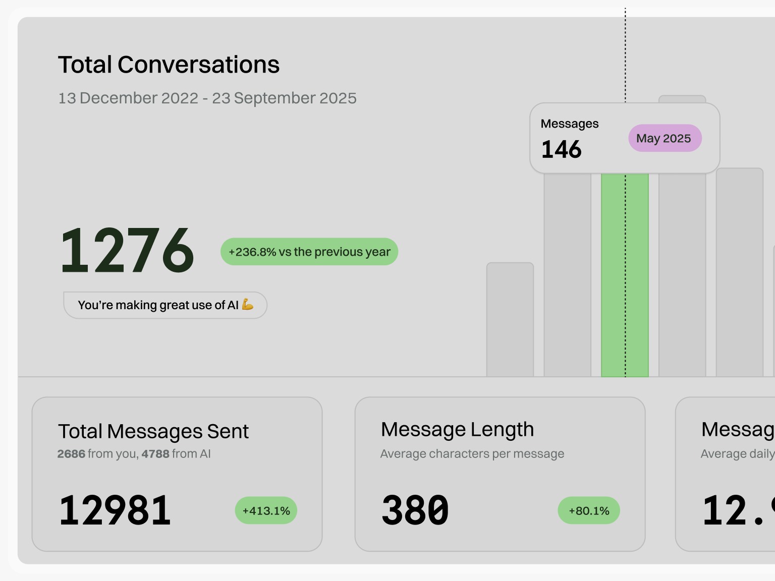 - Growth Metrics: Visualize your conversation trends, longest streaks, and usage patterns